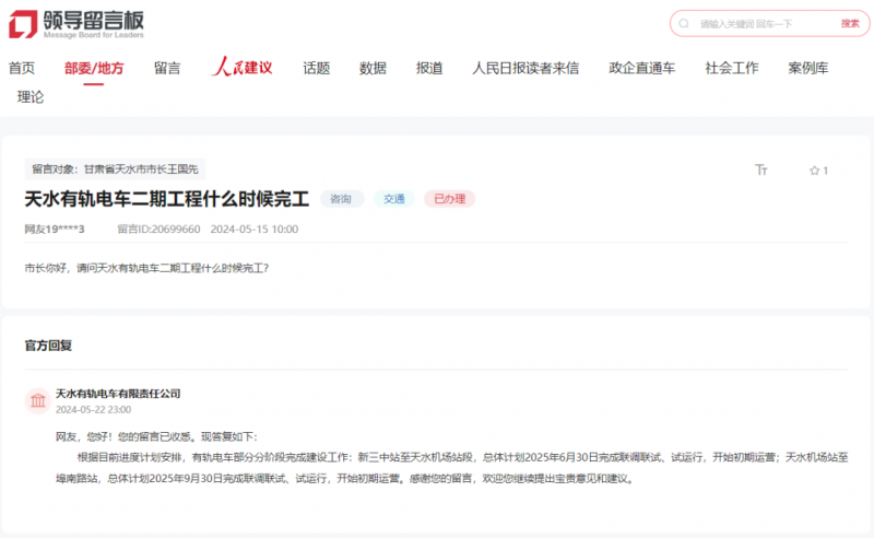 按照目前进度打算放置,总体打算2025年6月30日完成联调联试、试运转,天水有轨电车无限义务公司答复网友天水有轨电车二期工程什么时候落成?按照目前进度打算放置,总体打算2025年9月30日完成联调联试、试运转,天水机场坐至埠南坐,天水有轨电车无限义务公司答复网友天水有轨电车二期工程什么时候落成?按照目前进度打算放置,
